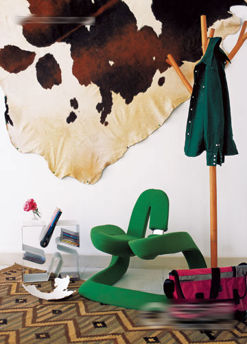 打破傳統(tǒng),將不規(guī)則形狀的毛皮掛在墻上,成為整個(gè)房間的焦點(diǎn),深淺不一的金棕色斑紋帶來原始與粗獷的感覺。一旁樹枝造型的衣架則呈現(xiàn)出自然的趣味,搭配一把曲線靈動(dòng)的綠色單椅,與墻飾形成鮮明、有趣的風(fēng)格混搭。