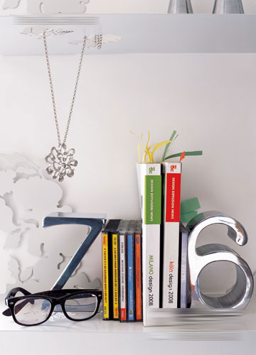在兩層收納架上,上層的鏤空設(shè)計(jì)改變了兩層分別獨(dú)立存在的單調(diào)格局,一條大花朵造型的項(xiàng)鏈貫穿其中,顯得活潑而別致。而字母造型的書擋將文件夾與CD光盤歸整到一起,不僅僅有收納之用,更顯出實(shí)用之外的美麗趣味。