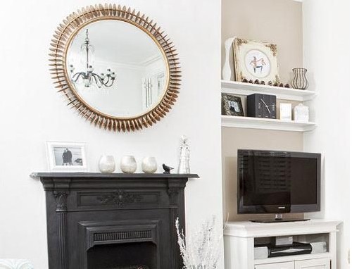 黑色老式壁爐,散發(fā)著年代的幽幽味道。白色的墻壁使黑色壁爐更為凸顯,嵌入式的設(shè)計,也能起到節(jié)省空間的作用。墻壁上的大鏡子,增加了空間的通透感。