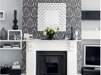 這個案例最吸引人眼球的就是壁爐后的背景墻設(shè)計,灰色襯底的壁紙和宛如迷宮的裝飾畫,使整個房間具有層次感。玻璃臺面的茶幾,放上白色的茶具,增加空間的品質(zhì)感。